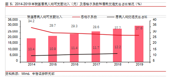 我国居民消费结构改善,消费升级促新兴需求增长。我国居民的人均可支配收入逐年增高,从 2014 年的 1.8 万元增长至 2019 年的 3.1 万元,5 年 CAGR 达 11.5%。在居民的消费支出结构中,满足基本生存要求的消费占比逐渐降低,恩格尔系数从 2014 年的 34.2%下降至 2019 年的 27.6%。相比之下,交通支出占比从 2014 年的 10.4%上升至 2018 年的12.2%,在居民消费升级的过程中,交通需求也有同步升级的空间和驱动力。