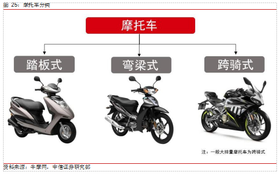 摩托车以汽油发动机提供动力,按照结构可分为踏板式、弯梁式和跨骑式三种类型。按照排量大小划分,可分为小排量、中排量和大排量,针对目前国内市场排量普遍较小的特点,我们认为 250CC 及其以上即可称为大排量摩托车(多为跨骑式)。小排量摩托车多作为代步工具用于通勤;大排量摩托车动力充足、速度上限高,但是价格较贵,多供摩托车爱好者休闲娱乐使用。在我国“限摩令”政策的背景下,大排量摩托车作为娱乐工具的发展趋势将逐步显现,具有较大的市场空间。
