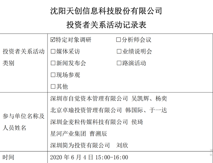 曾报送过重新上市申请资料的天创5在6月4日迎来5家机构调研,谈及多个问题也与重新上市有关。据天创5的《投资者关系活动记录表》披露,调研的5家单位分别是深圳市自觉资本管理有限公司、北京卓瑜投资管理有限公司、深圳金麦粒传媒科技有限公司、星河产业集团和深圳简为投资有限公司。