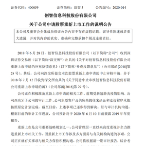 创智5明确表示,重新上市是公司重要战略规划之一,公司管理层一直以来高度重视并全力推进重新上市相关工作。因重新上市工作涉及多方面需与有关机构沟通的事项,公司正在就有关事项与相关方保持积极沟通。公司将根据新一期审计报告,综合考虑各方面因素,尽早完成重新上市申报材料,向深交所提交重新上市申请。