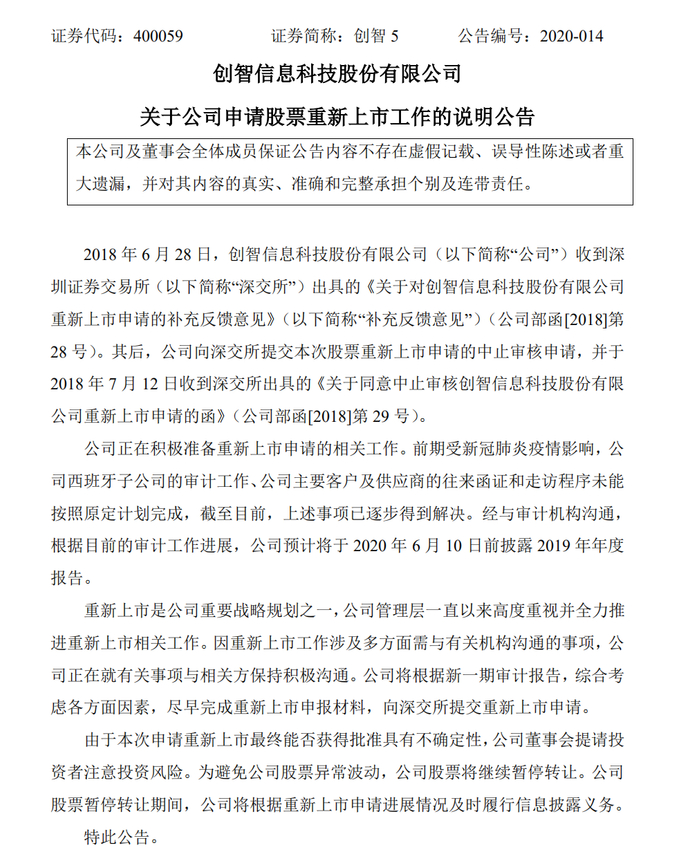 创智5则于6月2日发布关于公司申请股票重新上市工作的说明公告,表示正在积极准备重新上市申请的相关工作。前期受新冠肺炎疫情影响,公司西班牙子公司的审计工作、公司主要客户及供应商的往来函证和走访程序未能按照原定计划完成,截至目前,上述事项已逐步得到解决。经与审计机构沟通,根据目前的审计工作进展,公司预计将于2020年6月10日前披露2019 年年度报告。