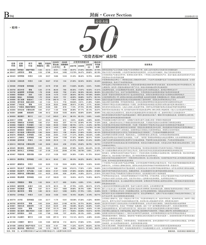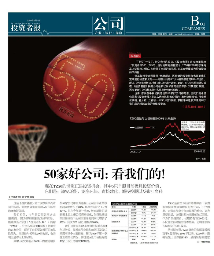 TZ50一岁了。当时的研究数据显示,TZ50自2006年以来跑赢上证综指235%。在经历了市场的洗礼后,它正在慢慢成为价值投资的风向标。但正如投资大师彼得·林奇所言,再稳健的投资组合也需要我们定期进行检查和反思——周期大约是6个月。所以,2009年1月5日,我们对TZ50进行调整,更新了9只TZ50样本股。现在,《投资者报》根据公司最新状况和新的经济形势,对其进行甄别,再次更新了29只样本股。