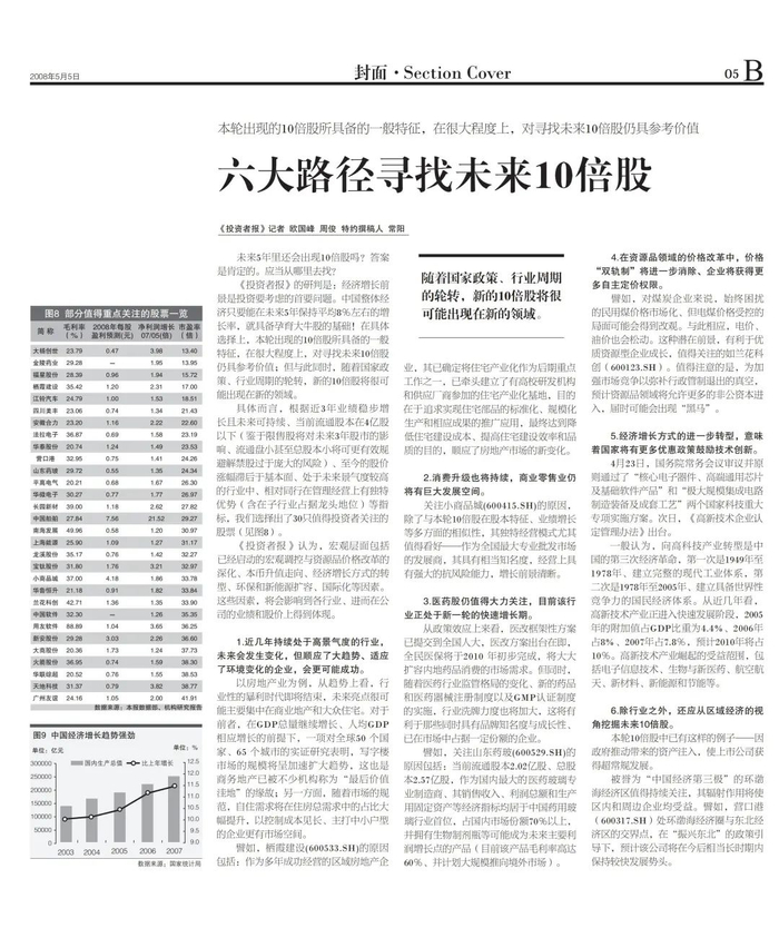 《投资者报》的研判是:经济增长前景是投资要考虑的首要问题。中国整体经济只要能在未来5年保持平均8%左右的增长率,就具备孕育大牛股的基础!