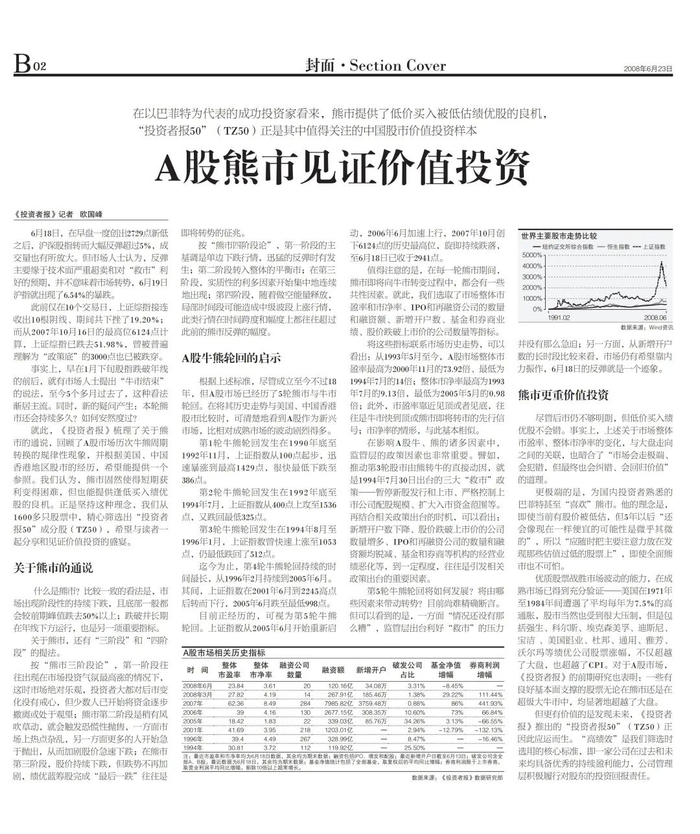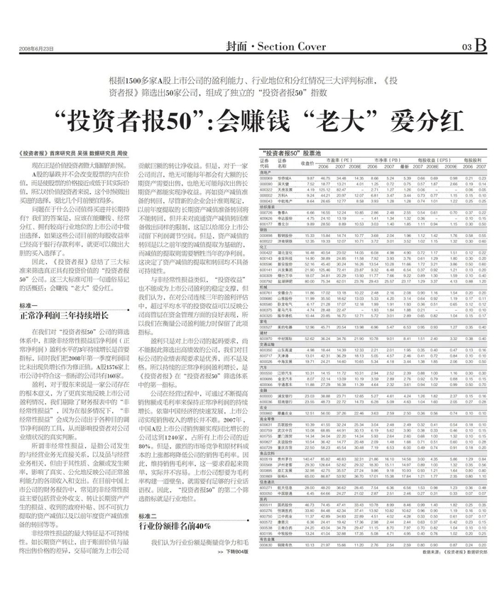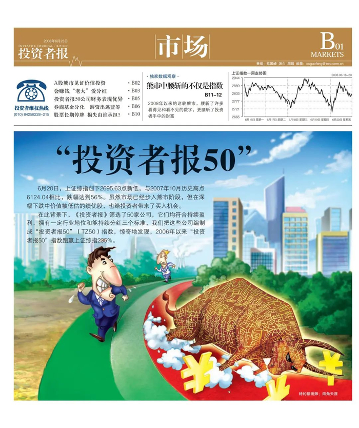 6月20日,上证综指创下2695.63点新低,与2007年10月历史高点6124.04相比,跌幅达到56%。虽然市场已经步入熊市阶段,但在深幅下跌中价值被低估的绩优股,也给投资者带来了买入机会。在此背景下,《投资者报》筛选了50家公司,它们均符合持续盈利、拥有一定行业地位和能持续分红三个标准,我们把这些公司编制成“投资者报50”(TZ50)指数,惊奇地发现,2006年以来“投资者报50”指数跑赢上证综指235%。