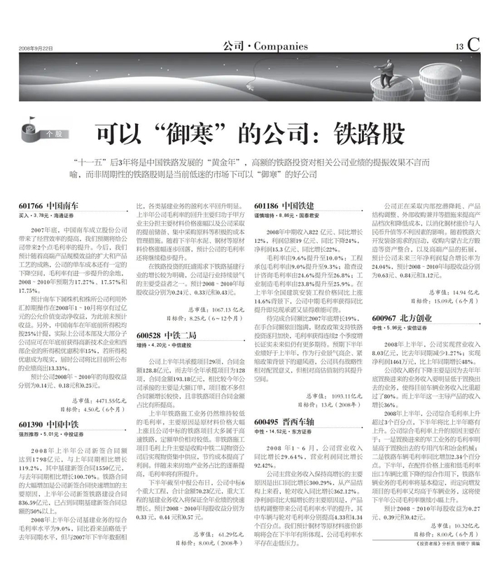 “十一五”后3年将是中国铁路发展的“黄金年”,高额的铁路投资对相关公司业绩的提振效果不言而喻,而非周期性的铁路股则是当前低迷的市场下可以“御寒”的好公司。