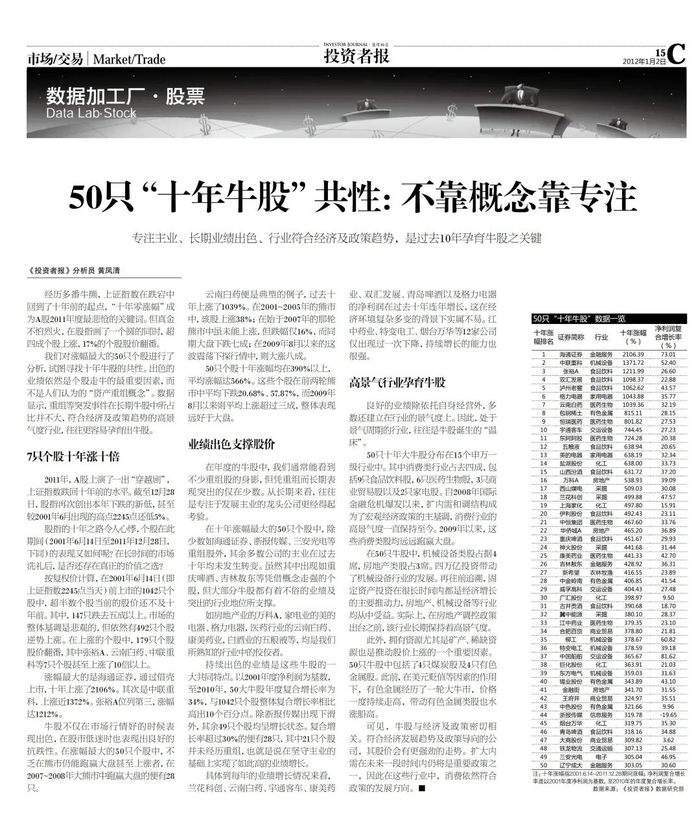 经历多番牛熊,上证指数在跌宕中回到了十年前的起点,“十年零涨幅”成为A股2011年度最悲怆的关键词。但真金不怕烈火,在股指画了一个圆的同时,超四成个股上涨,17%的个股股价翻番。我们对涨幅最大的50只个股进行了分析,试图寻找十年牛股的共性。出色的业绩依然是个股走牛的最重要因素,而不是人们认为的“资产重组概念”。数据显示,重组等突发事件在长期牛股中所占比并不大,符合经济及政策趋势的高景气度行业,往往更容易孕育出牛股。
