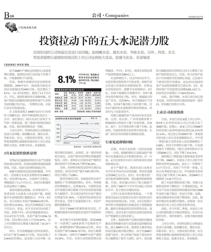 由于2008年产能的过快增长以及需求增长缓慢,我国的水泥行业仍处于价格下跌、产销萎缩的下行阶段。但是,根据中国建材信息总网的监测数据,2009年3月,我国重点联系水泥企业销量达到4985万吨,同比增长了8.1%,与1—2月份相比,提高了1.1个百分点。并且,我国宏观经济正逐渐转暖,房地产投资完成额的回收表明房地产行业的见底回暖已经不远,一切都预示着,水泥行业正在加速见底。