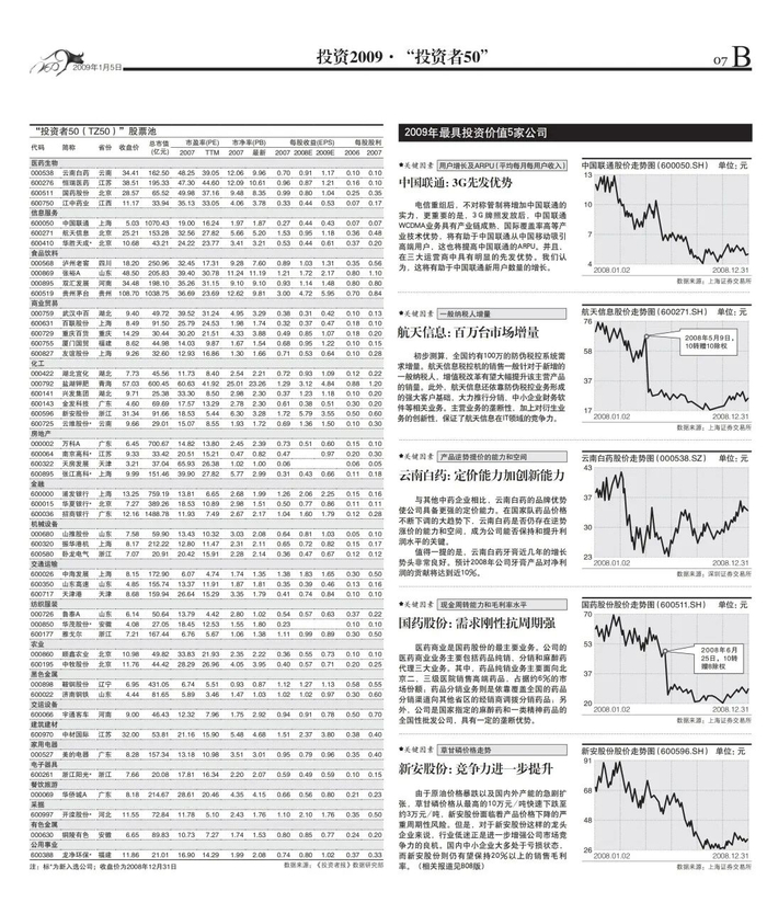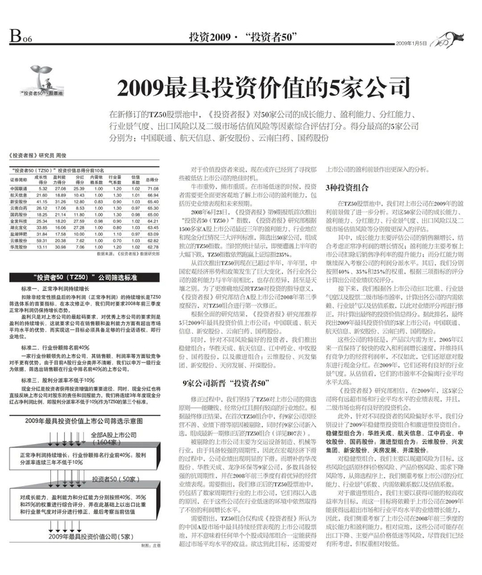 根据全面的研究结果,《投资者报》研究部推荐5只2009年最具投资价值上市公司:中国联通、航天信息、新安股份、云南白药、国药股份。