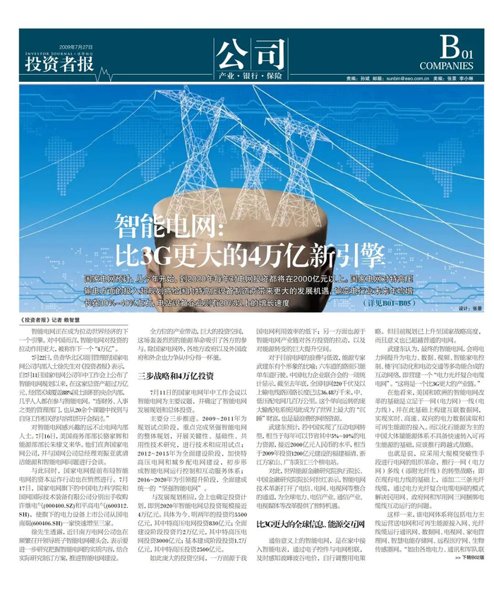国家电网预计,从今年开始,到2020年每年对电网投资都将在2000亿元以上,这意味着,输变电行业未来年均增长在30%~40%左右。智能电网正在成为拉动世界经济的下一个引擎。对中国而言,智能电网对投资的拉动作用更大,被称作下一个“4万亿”。