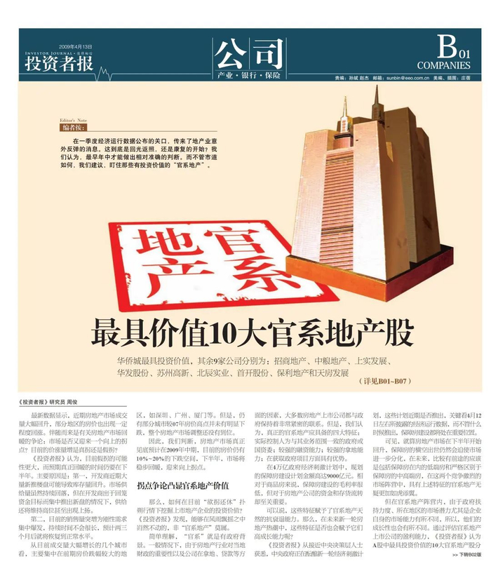 如何在目前“欲拐还休”扑朔行情下挖掘上市地产企业的投资价值?《投资者报》发现,能够在风雨飘摇之中岿然不动的,非“官系地产”莫属。简单理解,“官系”就是有政府背景。一般情况下,由于房地产行业对当地财政的重要性以及公司在拿地、贷款等方面的因素,大多数房地产上市公司都与政府保持着非常紧密的联系。