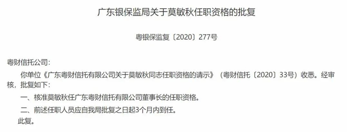 日前,广东银保监局发出关于莫敏秋任职资格的批复,核准了莫敏秋任广东粤财信托有限公司(简称“粤财信托”)董事长的任职资格。