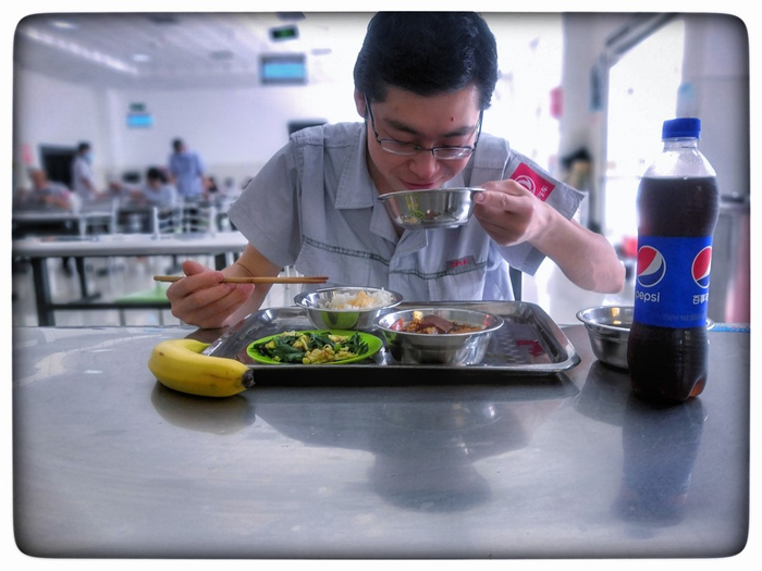 午间用餐舒心一笑——指导员陈诚经常是班组最后下班的人,当天设备没有异常,他在食堂就餐还能赶上爱吃的小菜和饮品。