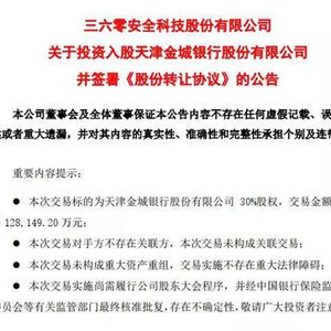 近日,互联网安全巨头360宣布,拟以12.81亿元受让天津金城银行股份有限公司(简称“金城银行”)5名原发起股东合计持有的9亿股股份,交易完成后,360将取得该行30%的股份,跻身第一大股东。