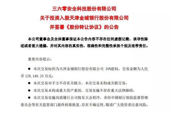 360拟出资12.81亿入主天津金城银行 为何偏爱银行业?