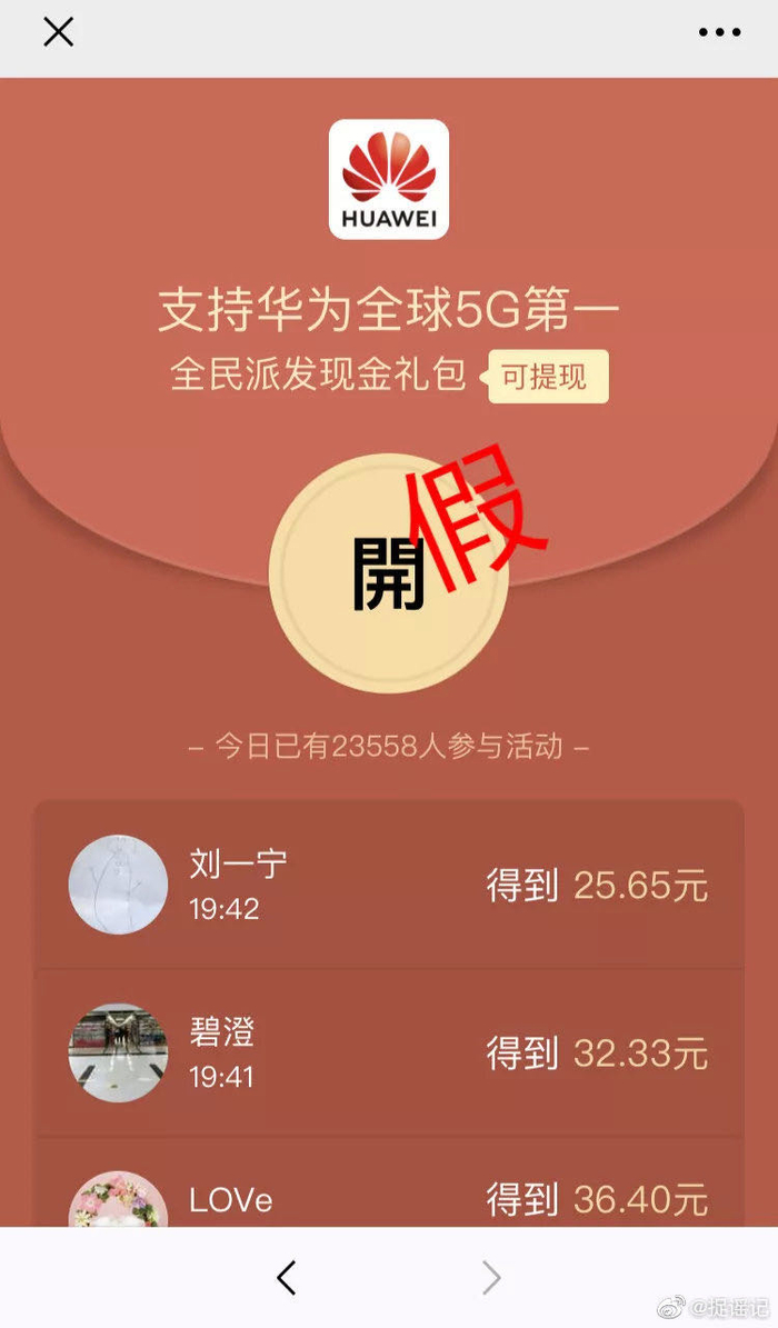 记者发现,此前也有不少网友称自己所在的微信群中,出现了一些群友转发的所谓“华为红包”。