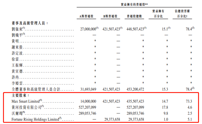 而刘强东旗下的Max Smart Limited和 Fortune Rising Holdings Limited合计持股4.485亿普通股,合计占比15.1%,拥有投票权为78.4%。而沃尔玛持股2.89亿股普通股,合计占比9.8%,投票权为2.5%。