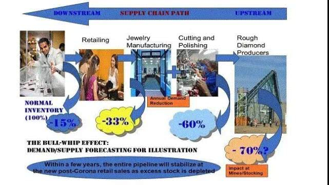 左边的是下游(零售端),右边的是上游(矿业公司)。终端减少15%的需求量,会带动零售公司减少33%左右的年采购量,由此引发的是中游(切磨工厂)-60%的原石采购,从而让矿业公司的产量-70%左右。图片来源:《Embrace the Diamond Industry‘s Ripple Effect》