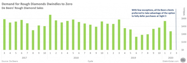 2020年戴比尔斯看货会原石需求降至零 图片来源:《2020年一季度全球钻石行业报告》