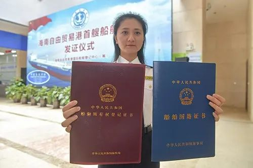 2020年6月4日,海南自由贸易港有关船舶登记政策正式落地实施,图为洋浦海事局的工作人员展示“中远海运兴旺”轮的船舶所有权登记证书和《船舶国籍证书》。