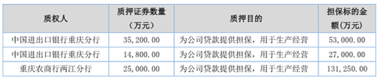 招股书显示,上述股票被质押给中国进出口银行重庆分行和重庆农商行两江分行,担保标的金额共计21亿元多。