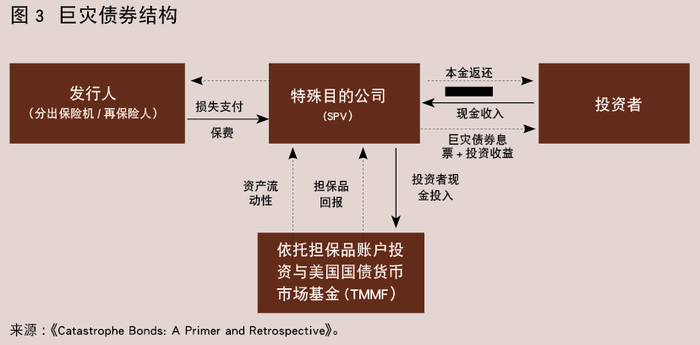 美国是自然灾害高发的国家和地区之一,在其发达的金融体系支持下,巨灾债券市场有客观需求和成功案例。按照典型业务架构,巨灾债券的参与主体通常包括投保人、保险公司(债券发行人)、特殊目的再保险公司(SPRV)和投资者四方。投保人是指从保险公司购买保险的单位和个人;保险公司是指向个人或企业销售保单,并从特设机构或特设再保险公司处购买再保险的公司;因巨灾债券投资标的较大,投资者基本上都是专业机构。在该类业务中,SPRVS发挥重要的枢纽作用,主要是针对发行人需求设计对应的流程与机制,确保巨灾发生时保险公司可以得到及时、足额的补偿,同时保障投资者获得与巨灾损失相连结的投资收益。SPRVS一方面与保险公司签订再保险合同,提供再保险保障,并收取一定的分保费;另一方面支持巨灾债券发行,将巨灾风险分散于众多的投资者。