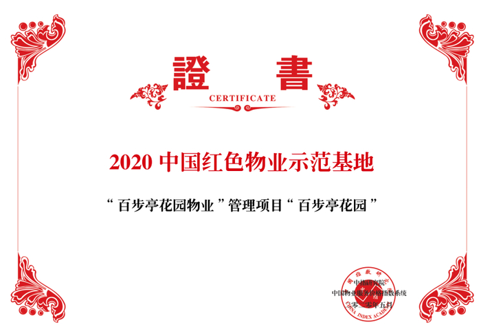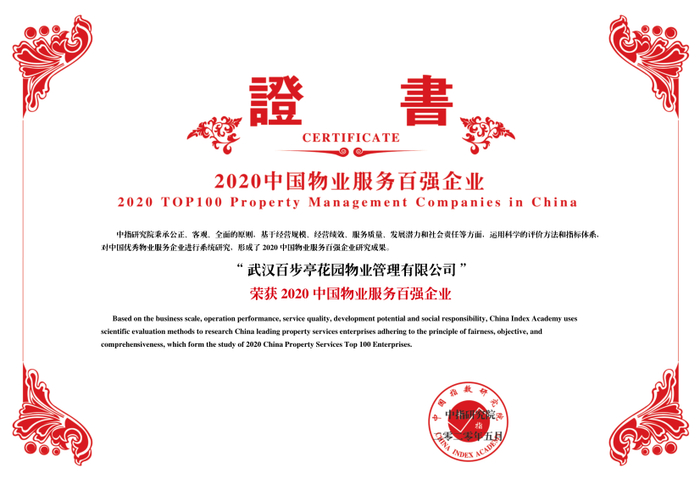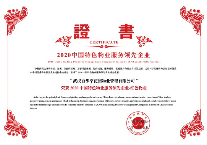 其中,武汉百步亭花园物业管理有限公司蝉联“2020中国物业服务百强企业”,同时获得“2020中国特色物业服务领先企业—红色物业”由其服务的“百步亭花园”被评为“2020中国红色物业示范基地”,“幸福时代四期”获得“2020中国五星级物业服务项目”。
