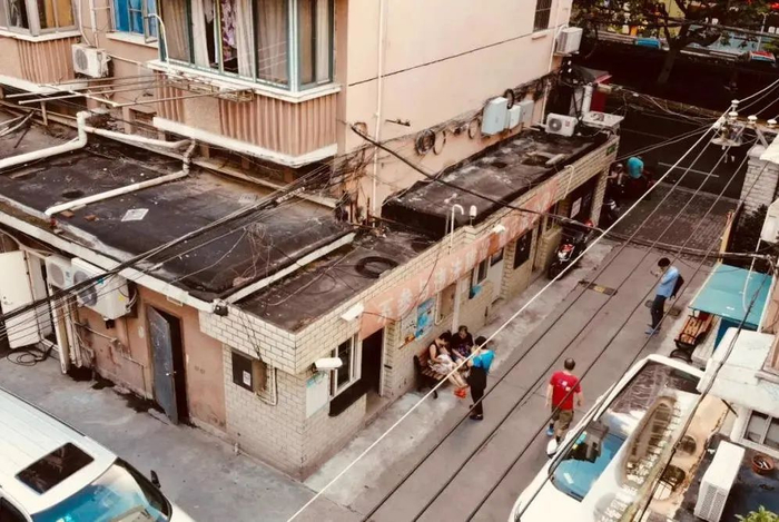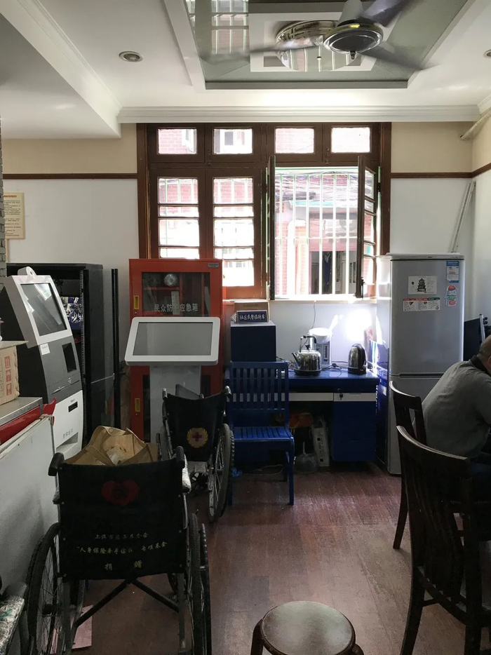 新华路669弄门卫室旁边,有一处净宽不到1.1米的小建筑,曾是公共电话亭和小卖部。随着电话和手机的普及,公共电话亭的功能取消,成了堆放快递的地方。空间虽小,却是小区的社交中心,居民们喜欢搬来自家椅子聚在这里聊天。