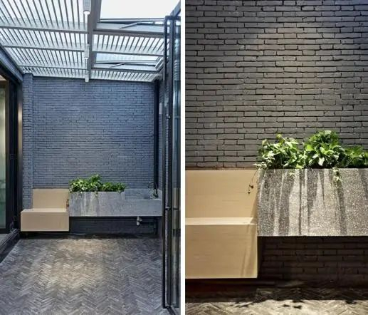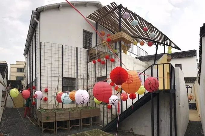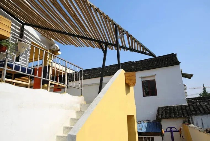 ▲前院将日照阴影用黄色涂料粉刷,提亮环境;后院改造成社区种植乐园;二楼露台设计棚架,纳凉休息。