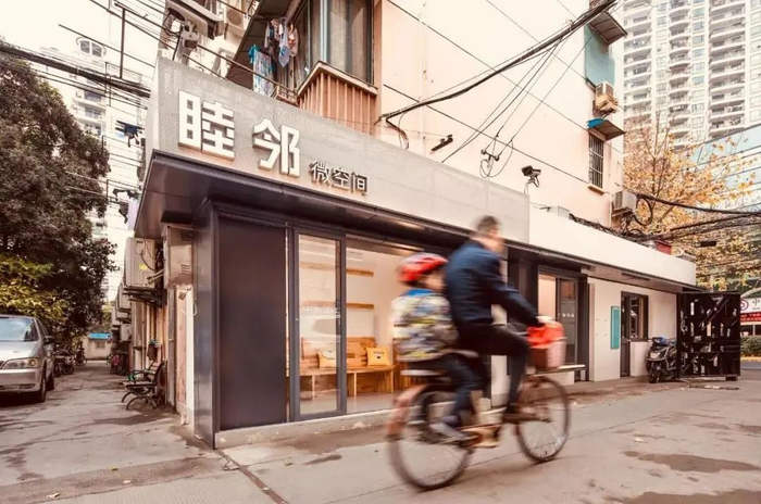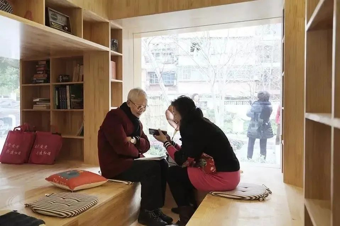 设计师与街道人员、热心居民商议,将这处小空间改造为“睦邻微空间”,成了分享书籍、交换旧物、表达心情的温馨角落。