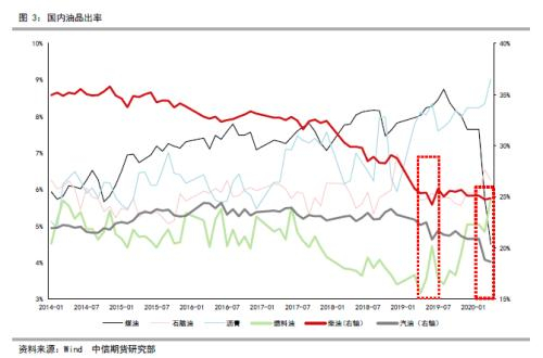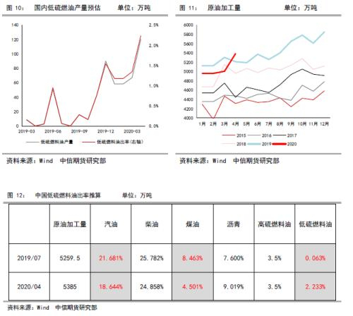 根据推算,国内1-4月低硫燃料油月均产量76万吨,(高于金联创月均产量43万吨,据金联创不完全统计,2020年1-5月份中国保税用低硫船用重质燃料油总产量在216万吨左右。1月份国内炼厂低硫燃料油产量在3.5万吨左右,2月份产量在17.6万吨左右,3月份产量在60万吨左右,4月产量在65万吨左右,5月产量在70万吨左右)2020年中国低硫燃油出口配额1000万吨-1500万吨,意味着(5-12)月均产量要达到87-150万吨,是通过提高开工还是调整出率来实现低硫燃料油供应呢?我们认为通过前者的概率偏高,2020因新冠疫情冲击,一季度炼厂开工同比季节性低位,开工下降背景下,生产燃料油大概率是以牺牲其他品种出率实现的,未来随着炼厂开工逐步提升,按照4月2.233%的低硫燃料油出率无需继续提高就能满足出口配额的数量,因此未来为生产低硫而大幅度调整汽柴油煤油出率较难看到,但大概率生产低硫燃油会分流汽柴油的供应。
