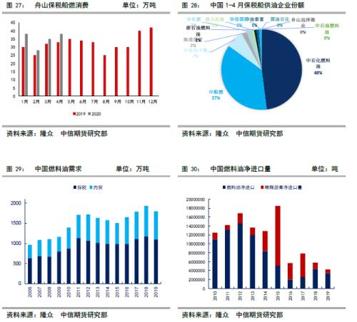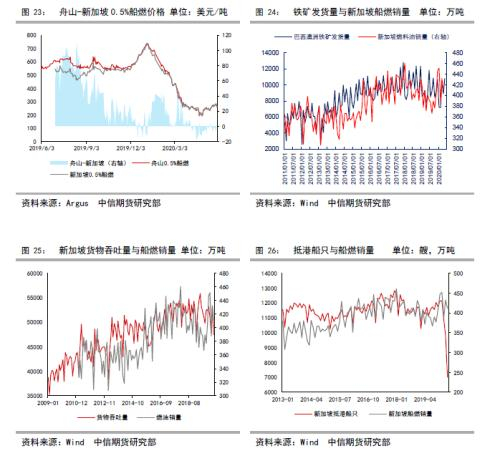 过去新加坡依靠燃油价格优势、吞吐量大、港口条件优越一直是全球最大的船燃消费港口,其燃料油市场定价地位较难撼动,我们在【中信期货能源(燃料油)】燃料油需求专题(二)航线与运费——专题报告20200602 指出,中国、日本、韩国是亚洲主要的铁矿石进口国;每年中国通过海上进口中东、欧洲、非洲、美洲的原油,世界前二十大吞吐量排名的港口中国有14个,其中宁波-舟山、上海吞吐量远超新加坡,在新加坡加注的船只多为来往南北的干散货船、油轮,一般来说吞吐量与新加坡船燃销量成正比,巴西、澳洲铁矿发货量与新加坡船燃销量成正比,我国港口吞吐量与消费量不成正比主要是原因是过去我国供应船燃需要进口,没有价格优势。船东通常在一条航线选择最具成本优势、服务条件最好的港口加注。过去我国船用燃料油未纳入一般贸易的免税退税目录,以往保税燃料油主要依靠进口,成本长期高于新加坡,制约了行业发展,国产燃料油不退税则不具备与保税进口燃料油的价格竞争力,一旦具备价格优势,我国燃料油市场有非常广阔的前景。燃油出口退税政策落实,国内低硫燃油产能逐步释放,国产的低硫燃油价格已低于新加坡,未来大概率船舶加注量会快速增加。2018年舟山海关保税船用燃料油供应量359.29万吨,占全国保税船用燃料油供应总量1180万吨的近1/3,2019年,浙江自由贸易区保税船用燃油直供量达410.27万吨,2020年中国保税船用燃料油规模有望达到1500-1800万吨。