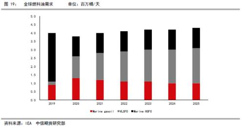 三、低硫燃料油需求全球80%的贸易量由海运实现,2019年全球航运燃料需求近400万桶/天,其中高硫燃油需求占比超70%。2016年10月,国际海事组织(IMO)海上环境保护委员会召开的第70届会议出台了《国际防止船舶造成污染公约》修正案、导则和通函等,重点对附则Ⅵ《防止船舶造成空气污染规则》进行了修正,决定自2020年1月1日起,在全球范围内实施船用燃油硫含量不超过0.50%的规定。