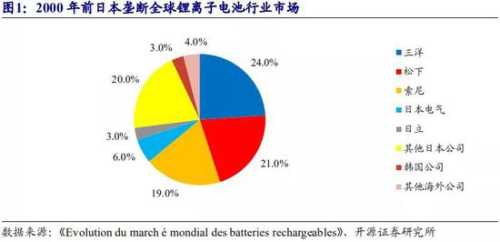 1991-2000 年,日本企业垄断全球锂离子电池市场。2000 年,日本锂离子电池企业总 体销售额占据全球销售总额的 93%。其中,三洋、松下、索尼三家企业分别占有全球市场的 24%、21%和 19%,在全球排名前三。同时期的韩国各企业市场占有率总和只有 3%,处于发展初期,中国则尚未出现一家具有规模化生产能力的企业。