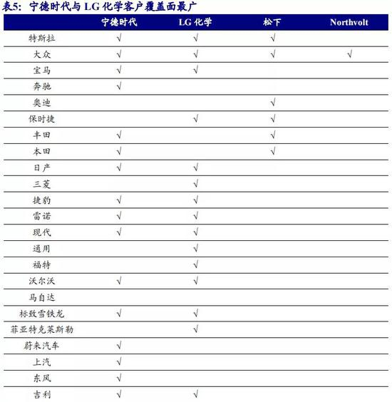宁德时代与 LG 化学的客户资源分别称霸中、欧市场。动力电池评价指标多,且单车电池数量多,产品一致性非常关键,因此动力电池供应商的认证周期普遍较长,动力电池供应商与车企绑定较深。目前来看,中国市场中,宁德时代客户群体最多,外资企业此前因国内“白名单”政策未能顺利打入中国市场。欧洲市场中,LG 化学客 户资源最多。松下和 Northvolt 存在客户结构单一问题。目前,松下的主要客户是特斯拉、丰田。Northvolt 的客户仅有大众,而且,Northvolt 的动力电池产线尚处在建设中。