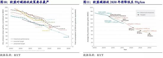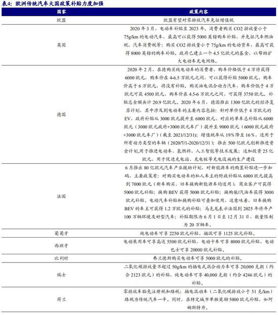 欧洲最严碳排放法规倒逼车企加速电动化转型,各国通过直接补贴与税收减免的政策促进行业长期发展。欧洲以企业平均 CO2 排放为管理目标,提出 2020 年需要行业平均需达到 95g/km 的目标,2025 年较 2021 年实际排放下降 15%(对应 81g/km), 2030 年较 2021 年下降 37.5%(对应 59g/km)。与双积分政策类似,对于新能源车型 (ZLEV)也给予核算倍数优惠,2020-2022 年分别为 2、1.67、1.33 倍,纯电车型排 放按 0 计算。同时也给予了企业一定合规灵活性,包括循环外技术优惠(不超过 7g/km)、企业自由组合达标等。对于不达标企业,每辆车排放超标 1g 处以 95 欧元 的罚款。
