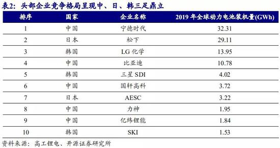 2019 年全球动力电池前十企业中,中国占据一半席位,行业头部企业竞争格局呈现中日韩三足鼎立。2019 年,全球前十大动力电池装机量企业排名中,第一梯队中包含了中国的宁德时代和比亚迪,同时也有来自韩国的 LG 与日本的松下。全球动力电池头部企业竞争形成了中、日、韩三国竞争的市场格局。