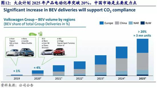 大众集团在中、欧市场布局逐渐明晰。大众集团投入 70 亿美元打造 MEB 模块化电动车生产平台,并将 MEB 平台供应到包括大众、斯柯达、西雅特、奥迪等品牌。依托MEB 纯电平台可以大幅提高各品牌零部件共用率,进而降低成本。与此同时全新平台在续驶里程、紧凑性等方面远优于现有传统平台改型的电动车。MEB 平台可以全方位覆盖 A0-C 级车型。大众集团通过平台化生产迅速上量,将形成对其他企业 “油改电”产品的降维打击。大众集团计划于 2022 年前在德国(兹维考、埃姆登、 汉诺威、德累斯顿、姆来达)、捷克(博莱斯拉夫)、中国(安亭、佛山)、美国(查 塔努加)建立 8 个 MEB 工厂。此外,大众集团加大对动力电池的布局与把控。2019 年与欧洲电池厂商 Northvolt 合资建设 16GWh 动力电池厂,2020年收购中国电池厂商国轩高科 26.47%的股权,保证电池的供应。