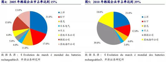 从电池企业角度来看,以三星 SDI 和 LG 化学为代表的韩国企业快速发展打破了日本企业垄断格局。我们认为,韩国企业发展迅速的核心原因主要有以下 2 点: