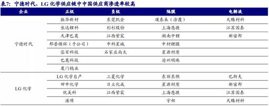 宁德时代和 LG 化学受益中国供应商带来的成本优势。供应链作为企业运营中重要的环节,直接影响一家企业产品的质量、性能以及制造成本。随着中国成为全球制造业加工中心,锂离子电池材料供应链已经完成了向中国转移。锂离子电池四大核心材料中,除正极材料环节竞争略显激烈以外,中国企业在其他三大核心材料中市场占有份额具有显著的优势,无论是原材料工艺水平还是生产质量均领先于其他竞争对手。短期内较难出现一个国家或一个区域实现对中国锂离子电池材料产业链的超越或取代。我们认为中国锂离子电池材料供应企业占比越大的电池厂商在电池原材料的供应稳定度、产品质量以及成本将会有更大竞争优势。目前,宁德时代实现 100% 国产化率,LG 化学、松下次之,Northvolt 中国材料供应商占比较低,供应链体系成 为未来与其他锂离子电池企业竞争的劣势。