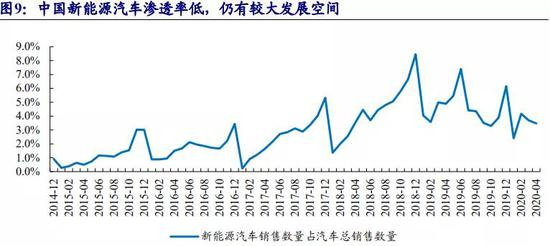我国新能源汽车渗透率处于较低水平,行业仍具有较大的发展空间。2019 年国家工信部颁布的《新能源汽车产业发展规划(2021-2035 年)》征求意见稿中指出,2025 年国内新能源汽车销量占比有望达到 25%,智能网联汽车销量占比达到 30%。从 2014 年 12 月至 2020 年 4 月的数据来看,我国新能源汽车销量占汽车总销量比例最高不超过 9%,2020 年 4 月的新能源车渗透率仅有 3.5%。离 2025 年国家规划指标有较大的距离,新能源汽车依旧有较大的成长空间。