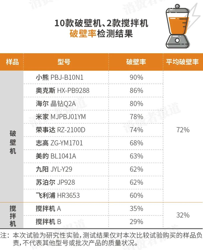 结果显示,10款破壁机的平均破壁率高达72%,而2款搅拌机的平均破壁率仅为32%,约为破壁机的一半。这表明,破壁机的破壁效果远远胜于普通搅拌机。