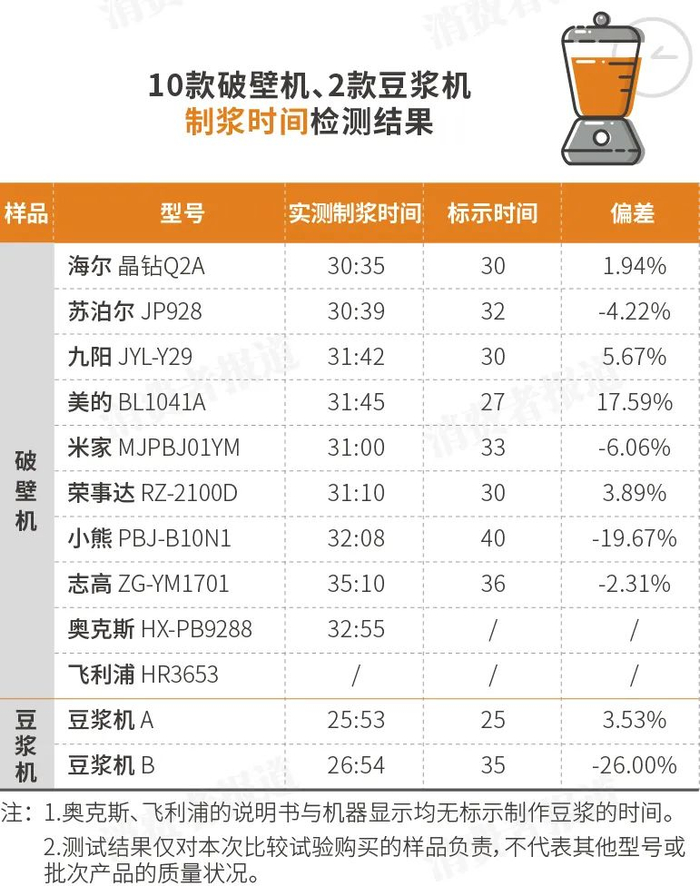另外,2款豆浆机制浆时间均比破壁机快,大概在25分钟左右。 值得一提的是,GB/T 26176-2010 《豆浆机》规定,实测的纯豆浆制浆时间与所明示的制浆时间的偏差不应超过5%,消费者可对比参考。