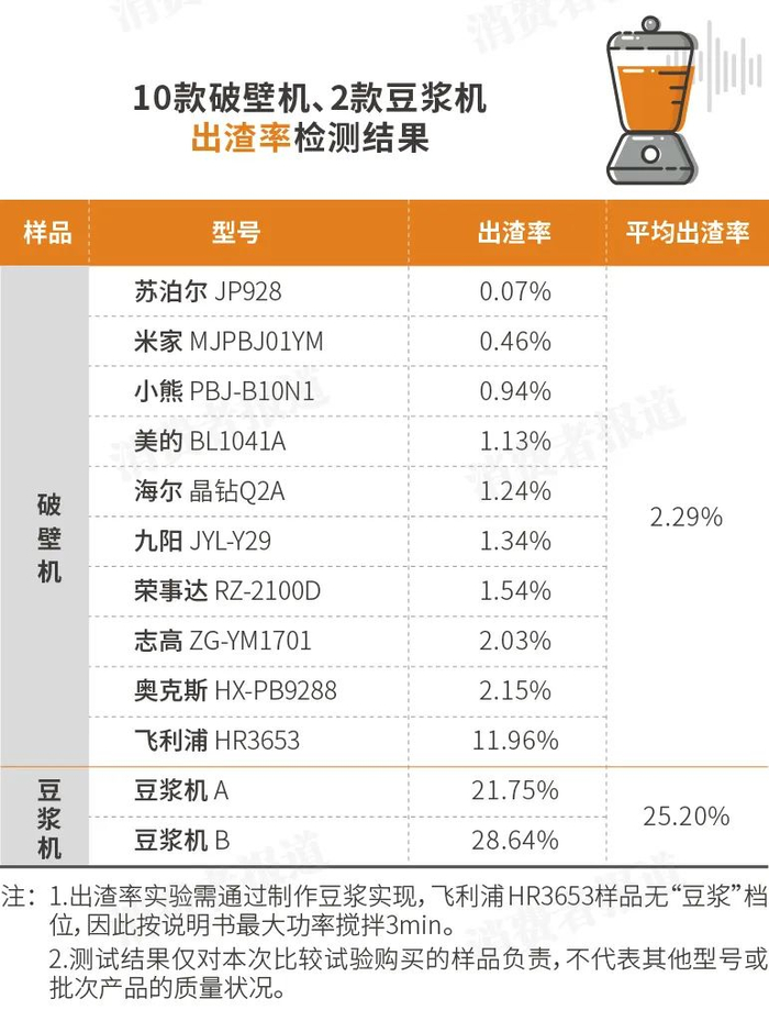 结果显示,破壁机的出渣率比豆浆机的更低(出渣率越低越好),10款破壁机的平均出渣率为2.29%,而2款豆浆机平均出渣率为25.20%。