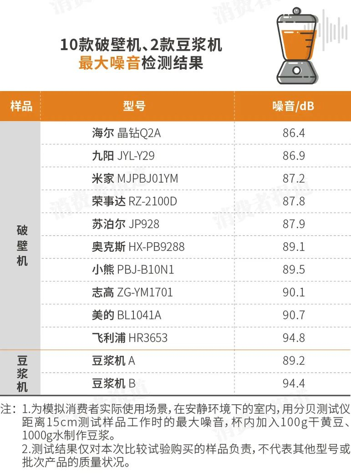 结果显示,12款样品的噪音实测值均高达85dB以上,尤其是飞利浦 HR3653破壁机最大噪音为94.8dB。