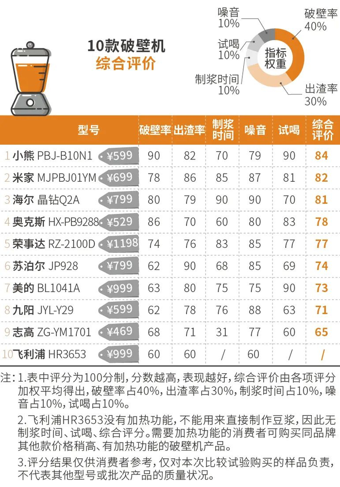 10款破壁机对比测评:飞利浦排名垫底;小熊、米家性价比高