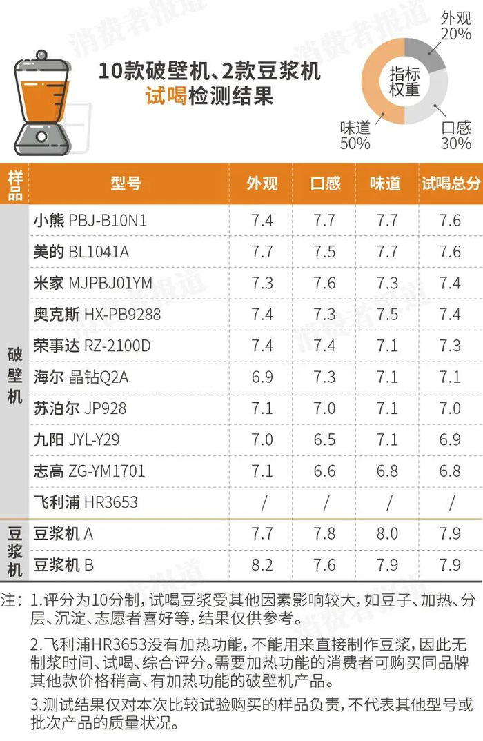 9款破壁机中,小熊 PBJ-B10N1、美的 BL1041A较受好评,评分总分为7.6分,几位志愿者均表示“口感细腻”“浓淡适宜”“没什么渣”“泡沫较少”等。