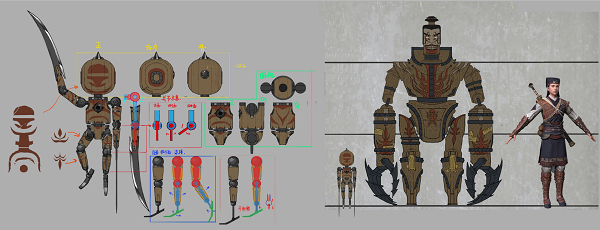 还有先秦势力与诸子百家的艺术加工,本就带有很强的传奇性,在《观海策》中被承袭并加强,成为了极具记忆性的元素,比如主角穆萱所制造的守城机关卫与人偶,以及反派偃师所制作的傀儡,都带有鲜明特点,很有“土木朋克”的解构精神。