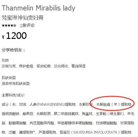 并且,官网上梵蜜琳神仙贵妇膏在宣传中还声称,主要成分含水解胎盘(羊)提取物,且详情页面有显眼的“胎盘素”字样。但有业内人士称,胎盘素美容、抗衰只是谣言,并无依据。