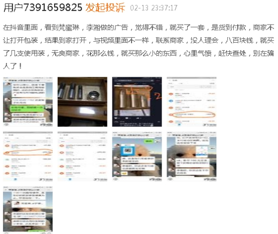 记者注意到,今年2月份,在新浪旗下消费者服务平台黑猫投诉上,也有消费者称,“在抖音里面,看到梵蜜琳,李湘做的广告,觉得不错,就买了一套,是货到付款,商家不让打开包装,结果到家打开,与视频里面不一样,联系商家,没人理会,八百块钱,就买了几支使(试)用装,无良商家,花那么钱,就买那么小的东西,心里气愤,赶快查处,别在骗人了!”。