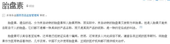 百度百科上关于“胎盘素”这一词条的介绍中也指出,“胎盘素可以美容甚至延寿,这早就已经被证实是个骗局。然而,还有很多人对此深信不疑。遍查各类正规的医学期刊,将胎盘素作为医用物品看待的,几乎没有。中国不允许使用胎盘素,正规的医疗机构都不提供相关治疗。”(该词条由国家药监局审核)